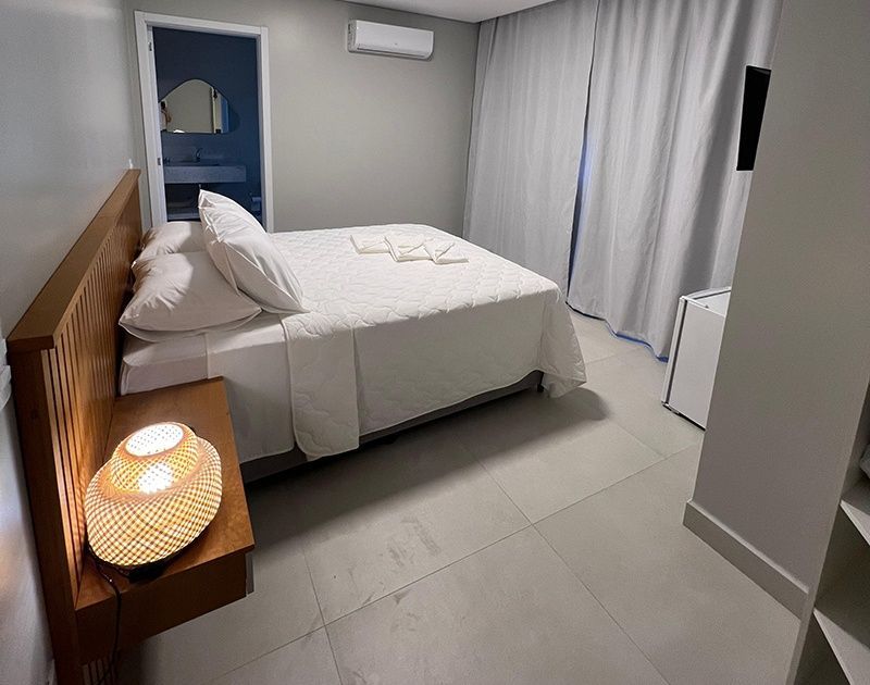 Suíte Standard sem banheira e sem sacada. As nossas suítes de categoria Standard (Sem Banheira) possuem cama de casal Queen Size, ar condicionado Split, SmartTV, cofre digital e frigobar. Vista parcial para o mar da Praia de 4 ilhas. São suítes compactas (15m²) bem planejadas, acesso por escadas.