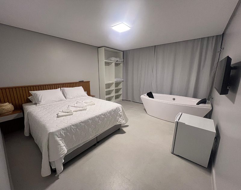 A nossa suíte de categoria com Sacada e Hidromassagem possui: Cama de casal Queen Size (com cama auxiliar de solteiro), ar condicionado Split, SmartTV, cofre digital, frigobar, banheira de Hidromassagem dupla e sacada. Vista Parcial para o mar de 4 ilhas. São suítes compactas (25m²) bem planejadas, acesso por escadas.